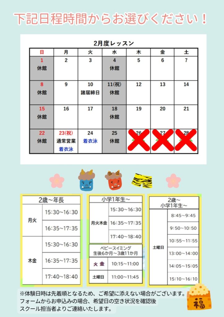 体験日は、✖がついている日、以外が対象です!