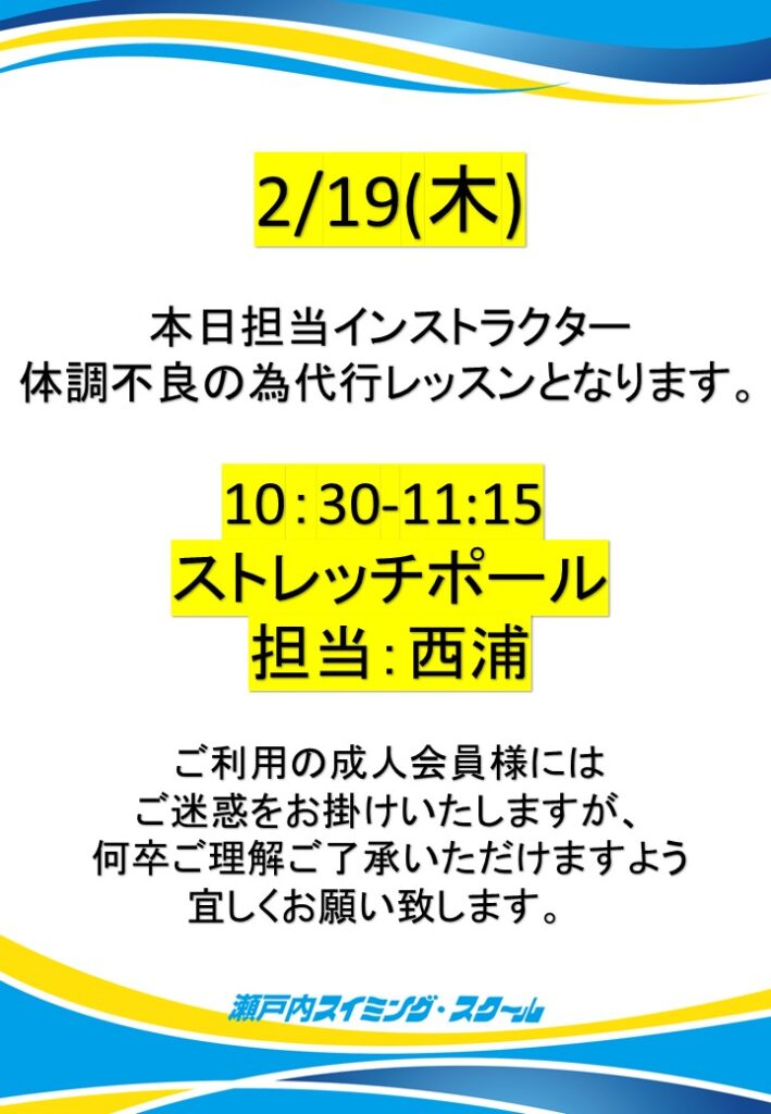 2/19(木)のスタジオレッスンですが、下記レッスンは代行となります。