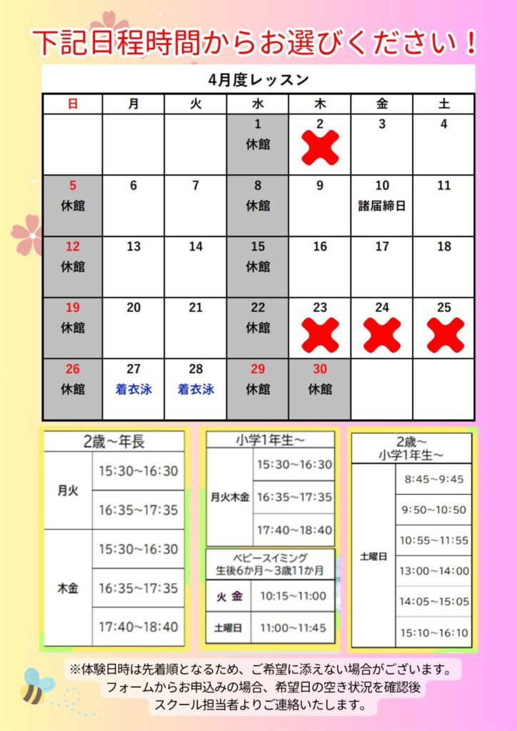 体験日は、下記画像の✖がついている日以外からお選びください!